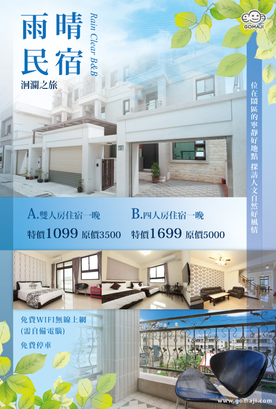 只要1099元起,即可享有【花蓮-雨晴民宿】洄瀾之旅專案A.雙人/B.四人〈含A.雙人房/B.四人房 住宿一晚 + 免費WIFI無線上網(需自備電腦) + 免費停車〉